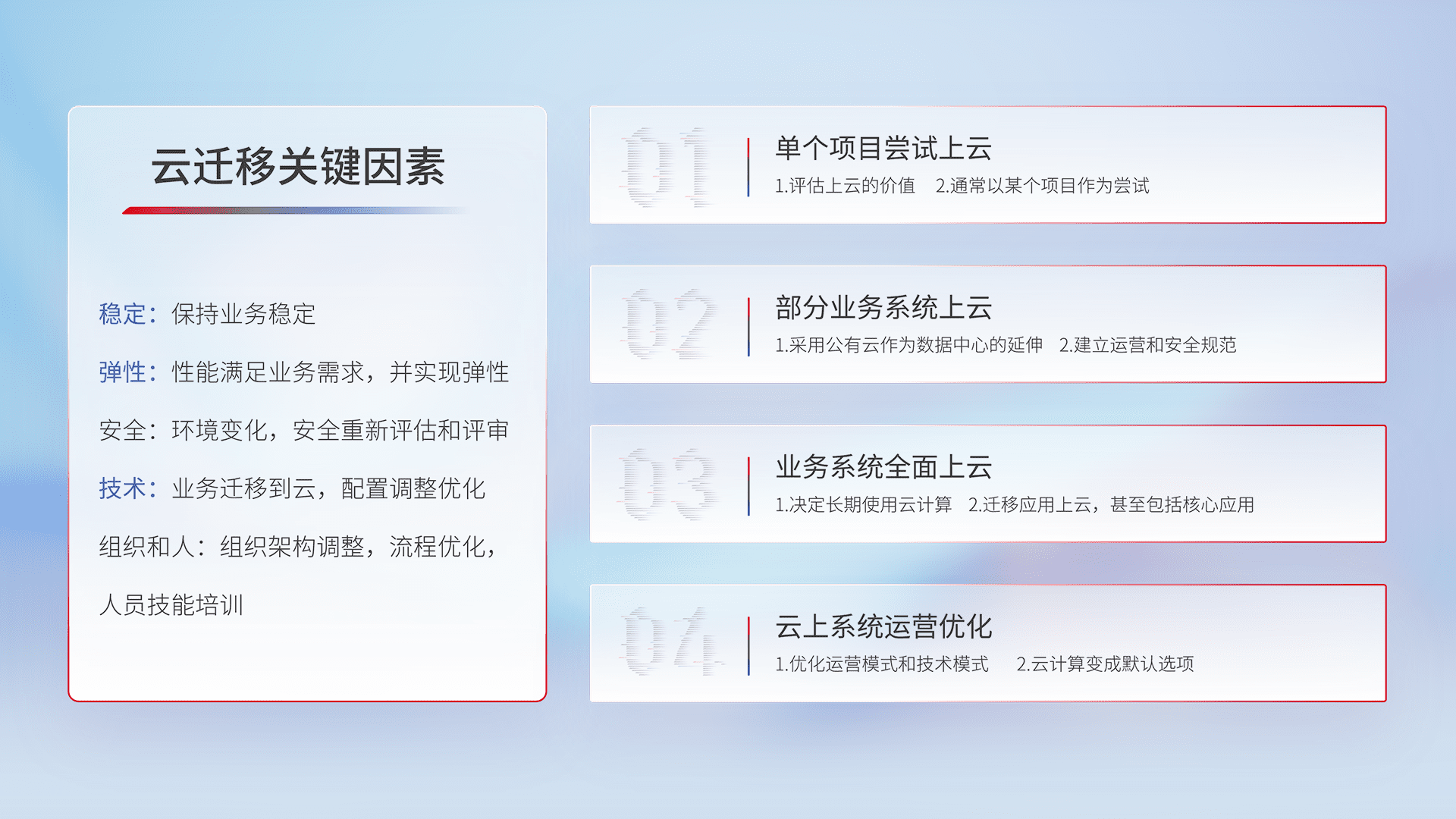 结合实际业务,,从规划设计、、、云平台选型、、、云原生改造、、数据迁移、、、集成交付,,,,迁移全过程为客户识别最佳上云路径,,,做好风险识别管理,,,,设计网络架构、、、身份权限、、、安全审计合规、、操作审计、、、、日志审计、、、、监控告警策略、、多站点容灾设计等,,对云上基础设施进行整体规划,,,,提升IT治理水平,,,以满足弹性、、、高可用、、、、高性能的需求。。