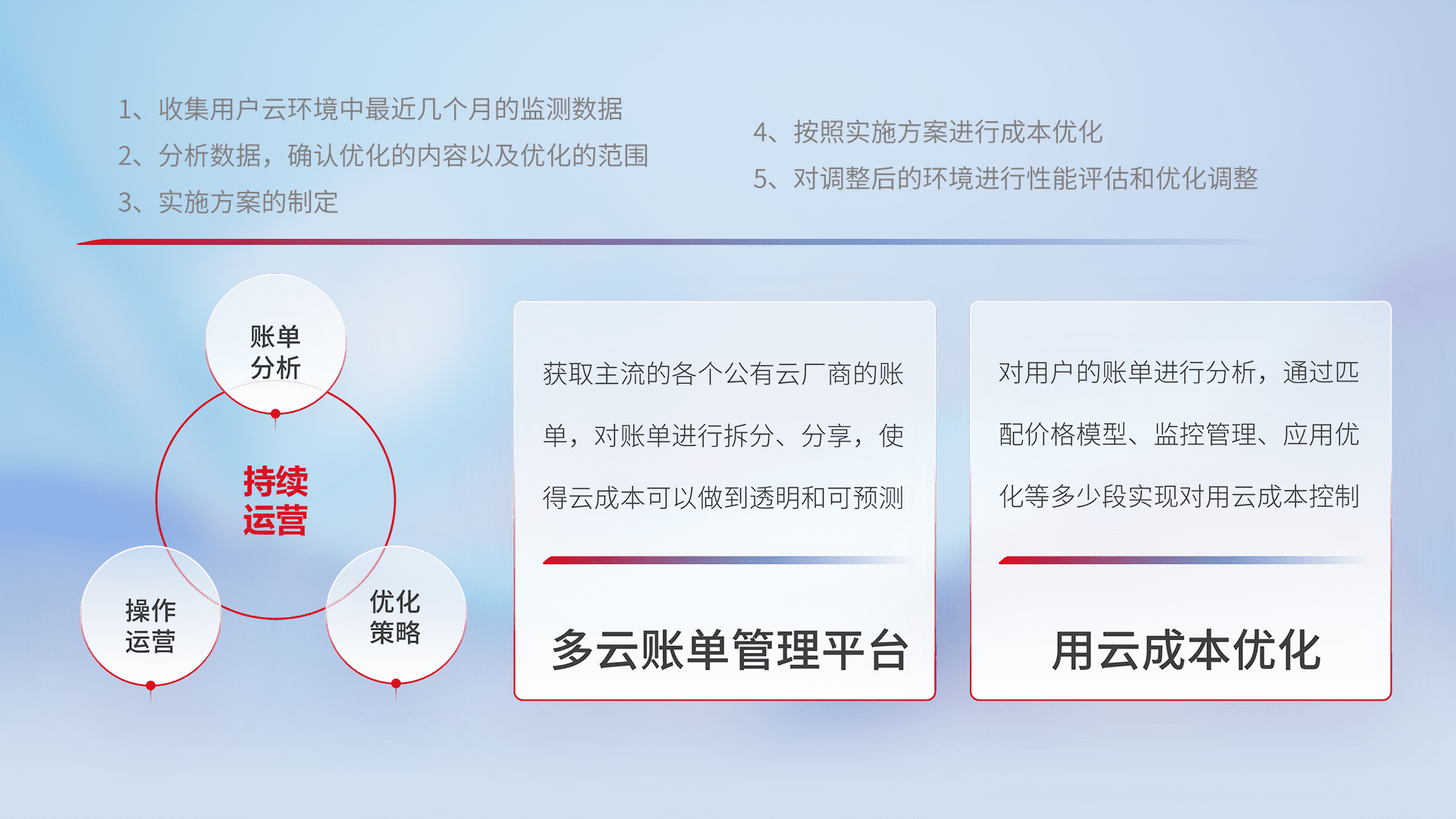 通过多云纳管,,以统一的资源数据模型把客户的云资源进行抽象和封装,,,,进而实现对多云资源的统一操作,,,保障云资源管理的可靠性、、稳定性与可用性。。。量身定制化运维内容,,,,配置、、开发运维、、、补丁管理、、备份、、监控、、、、认证和访问管理、、、审计和日常巡检等,,保障在用云过程中的可靠度,,,,稳定度以及高可用率。。。